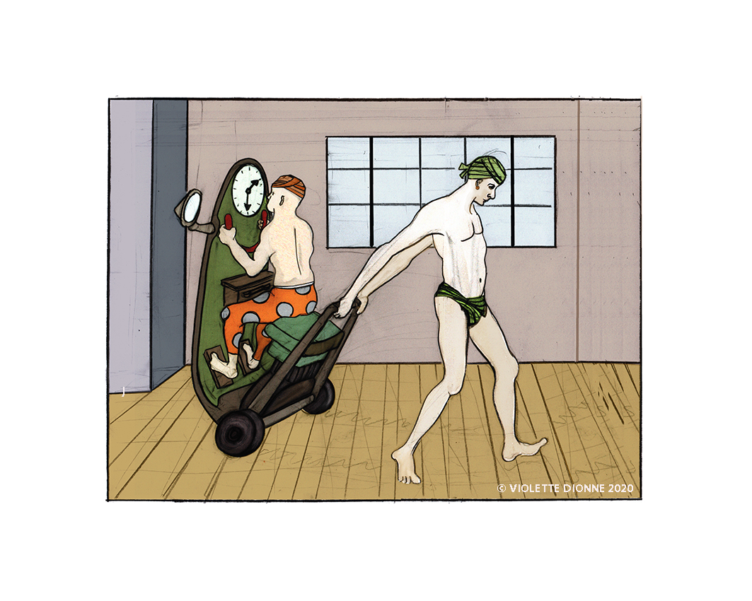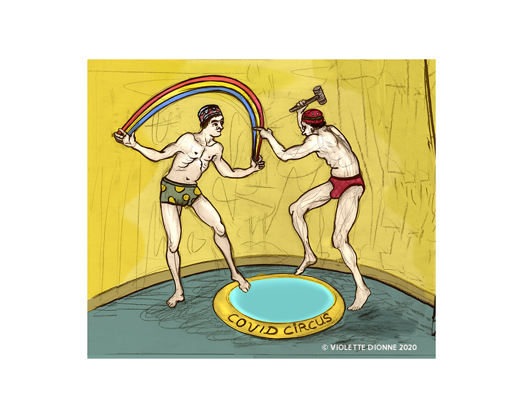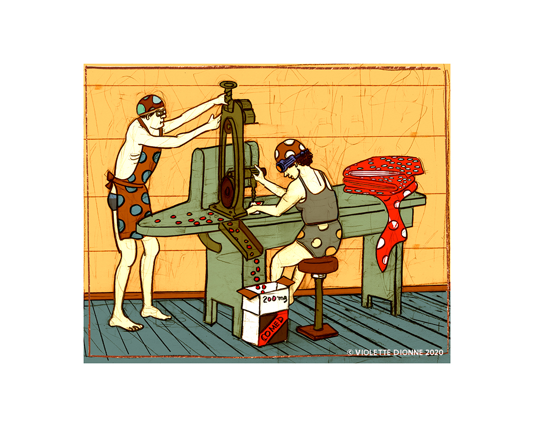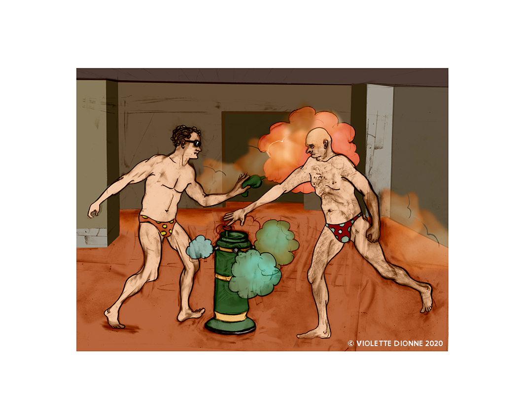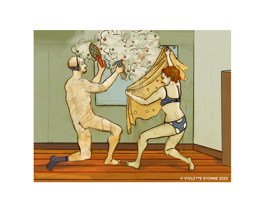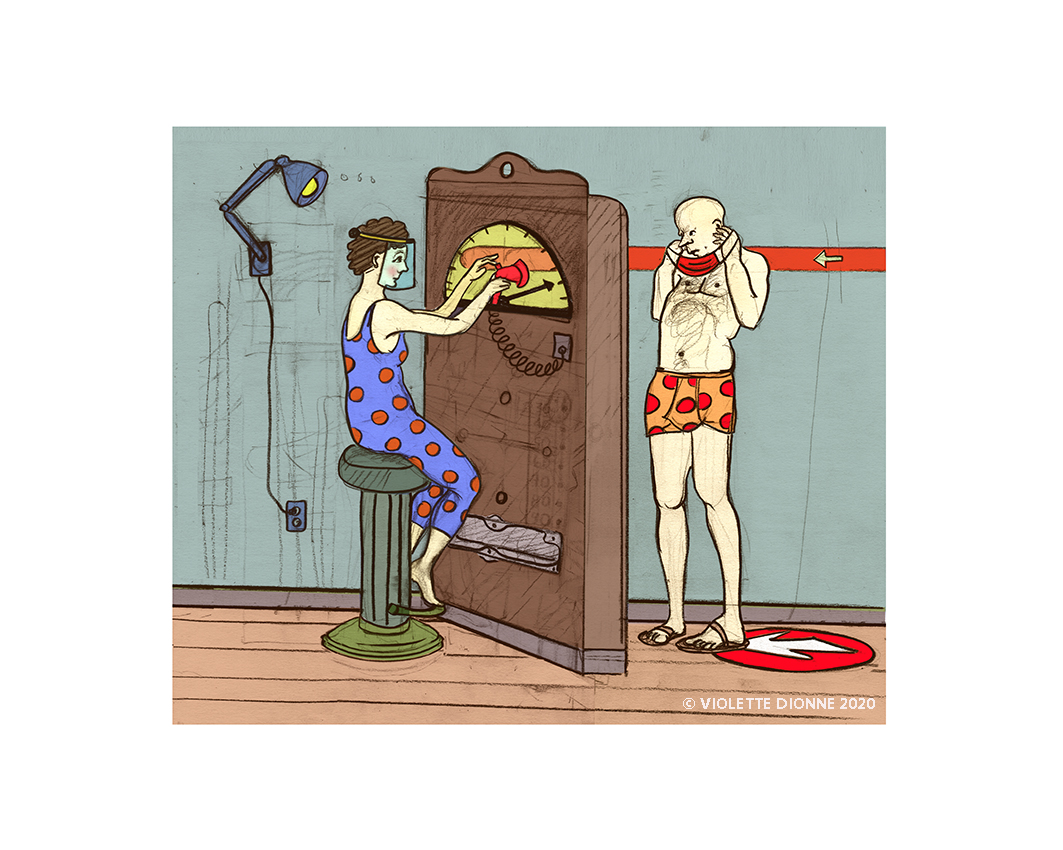 Dans cette série d’images, l’artiste utilise un certain nombre de procédés qui caractérisent la nouvelle figuration contemporaine. Ce sont des moyens d’expression narratifs qui jouent avec toutes les ressources techniques de la représentation (effets d’effacement, dégradés, graphisme, textures). Ces images colorées, ludiques, nous invitent à un parcours de scènes de la vie quotidienne en temps de pandémie. L’ensemble de cette production présente des aspects propres aux images d’Épinal qui reproduisent le plus souvent des sujets amusants, tirés de situations vécues, parfois loufoques. Ainsi, en usant de diverses stratégies esthétiques de détournement, l’artiste parvient à créer des petites comédies bouffonnes d’une «inquiétante étrangeté» à l’image du monde dans lequel nous vivons. La présence dans les images de dispositifs farfelus ‒ petits écrans de protection, ventilateurs bricolés par des amateurs ou encore systèmes de distanciation ‒ fait écho aux  sculptures récentes de Violette Dionne représentant des machines dysfonctionnelles.