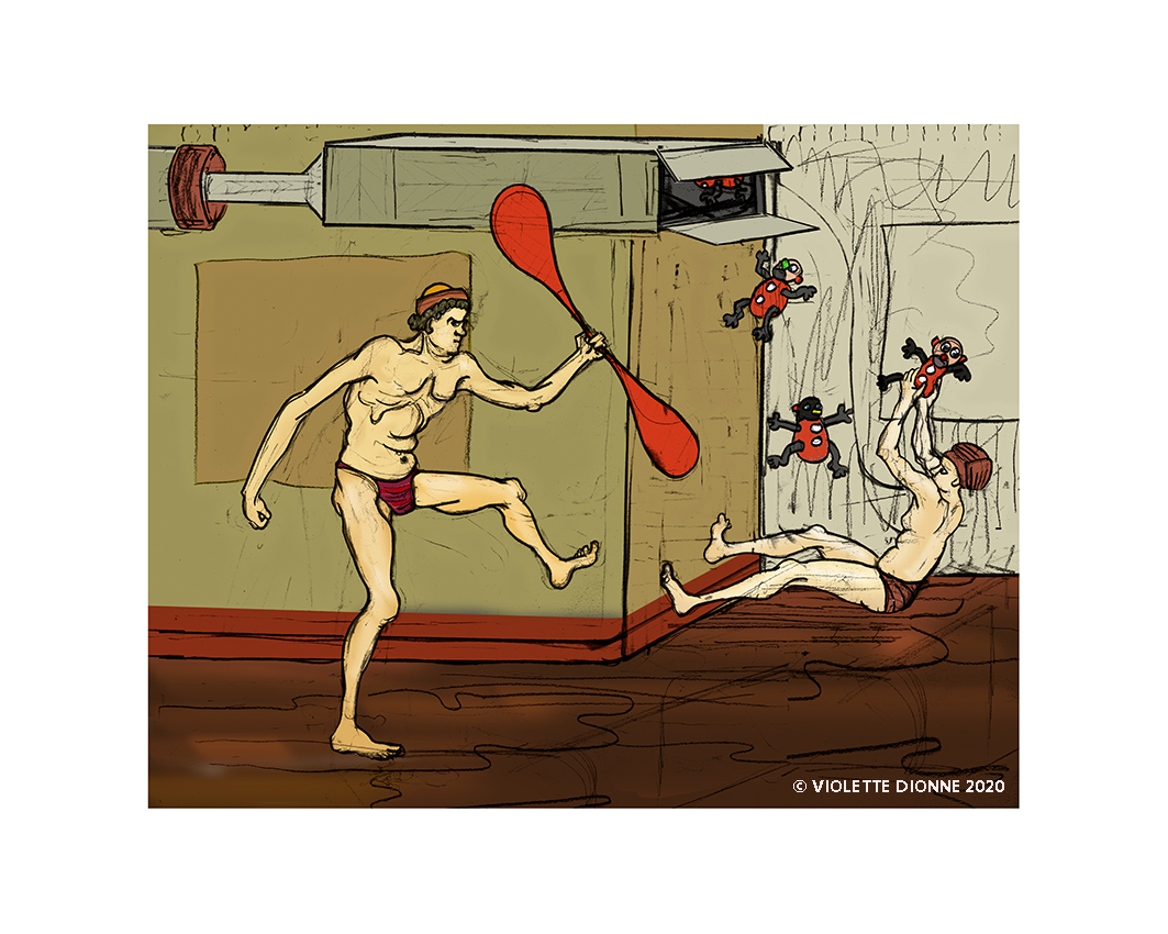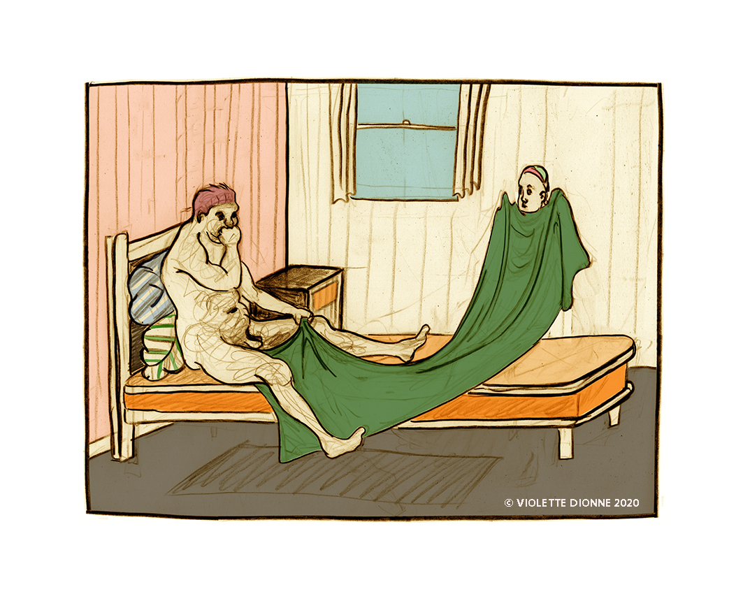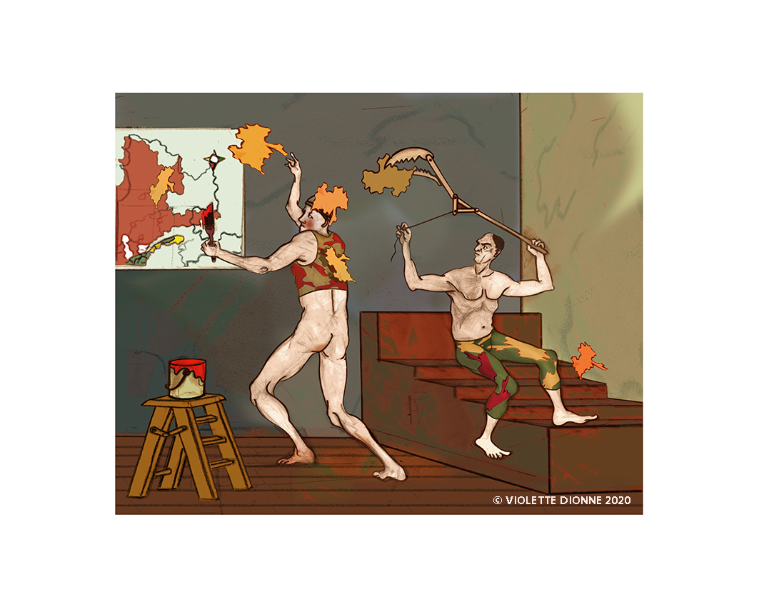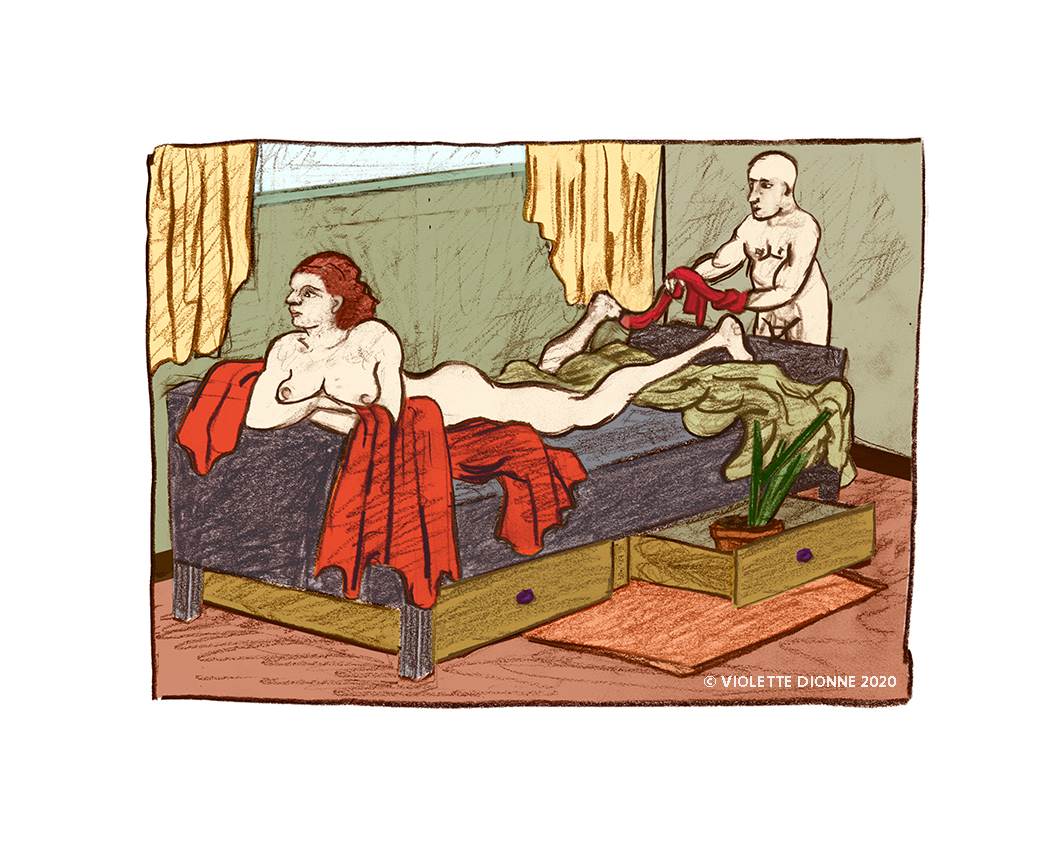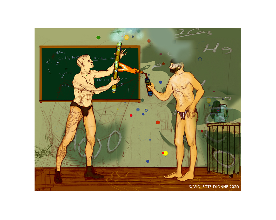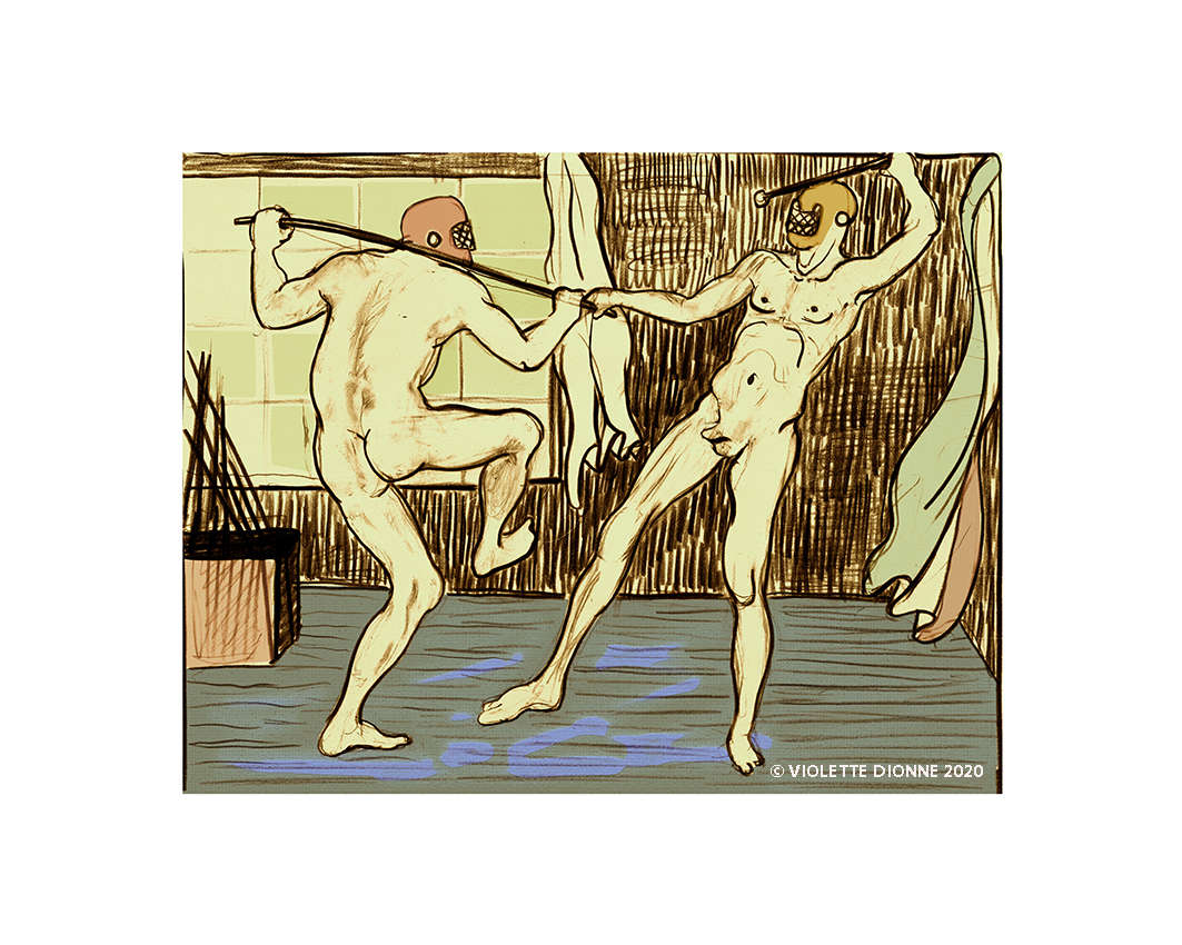 Dans cette série d’images, l’artiste utilise un certain nombre de procédés qui caractérisent la nouvelle figuration contemporaine. Ce sont des moyens d’expression narratifs qui jouent avec toutes les ressources techniques de la représentation (effets d’effacement, dégradés, graphisme, textures). Ces images colorées, ludiques, nous invitent à un parcours de scènes de la vie quotidienne en temps de pandémie. L’ensemble de cette production présente des aspects propres aux images d’Épinal qui reproduisent le plus souvent des sujets amusants, tirés de situations vécues, parfois loufoques. Ainsi, en usant de diverses stratégies esthétiques de détournement, l’artiste parvient à créer des petites comédies bouffonnes d’une «inquiétante étrangeté» à l’image du monde dans lequel nous vivons. La présence dans les images de dispositifs farfelus ‒ petits écrans de protection, ventilateurs bricolés par des amateurs ou encore systèmes de distanciation ‒ fait écho aux  sculptures récentes de Violette Dionne représentant des machines dysfonctionnelles.