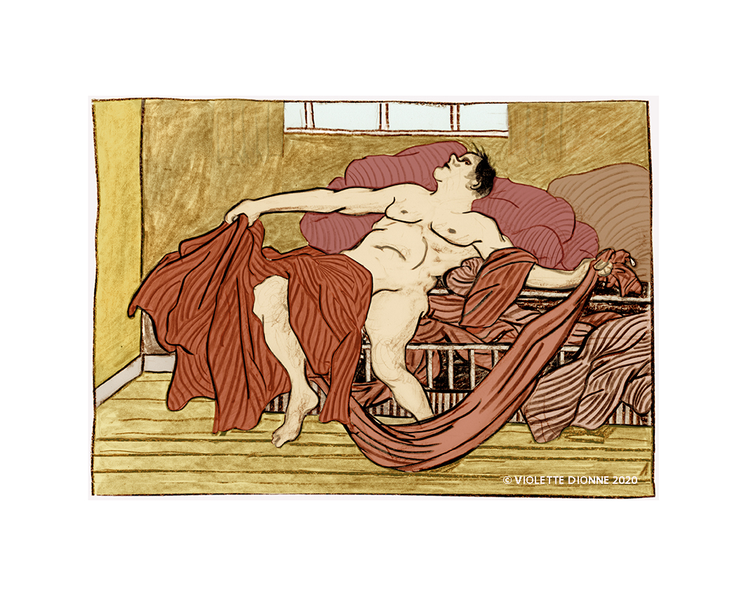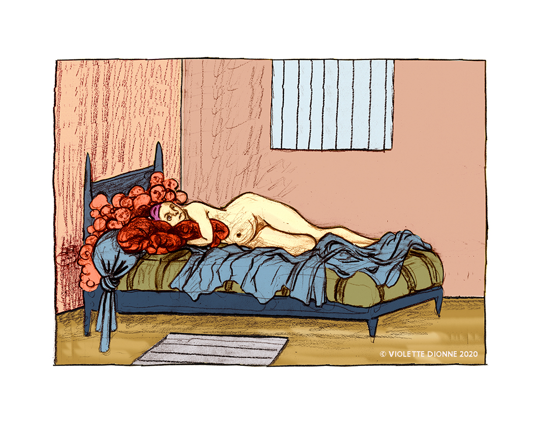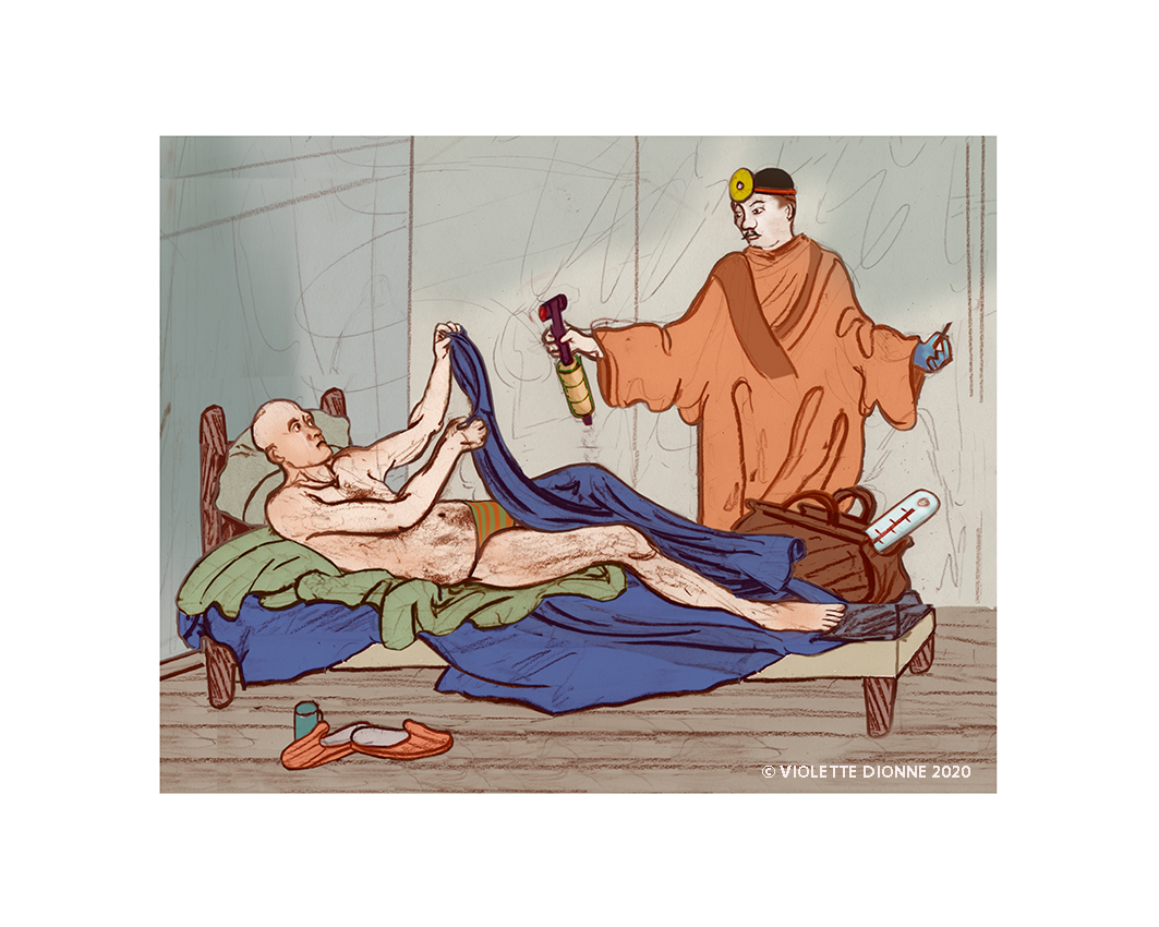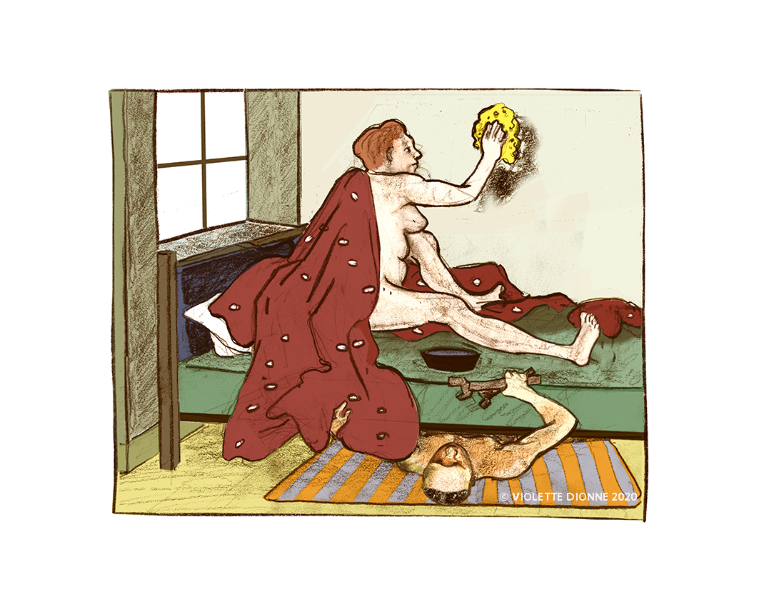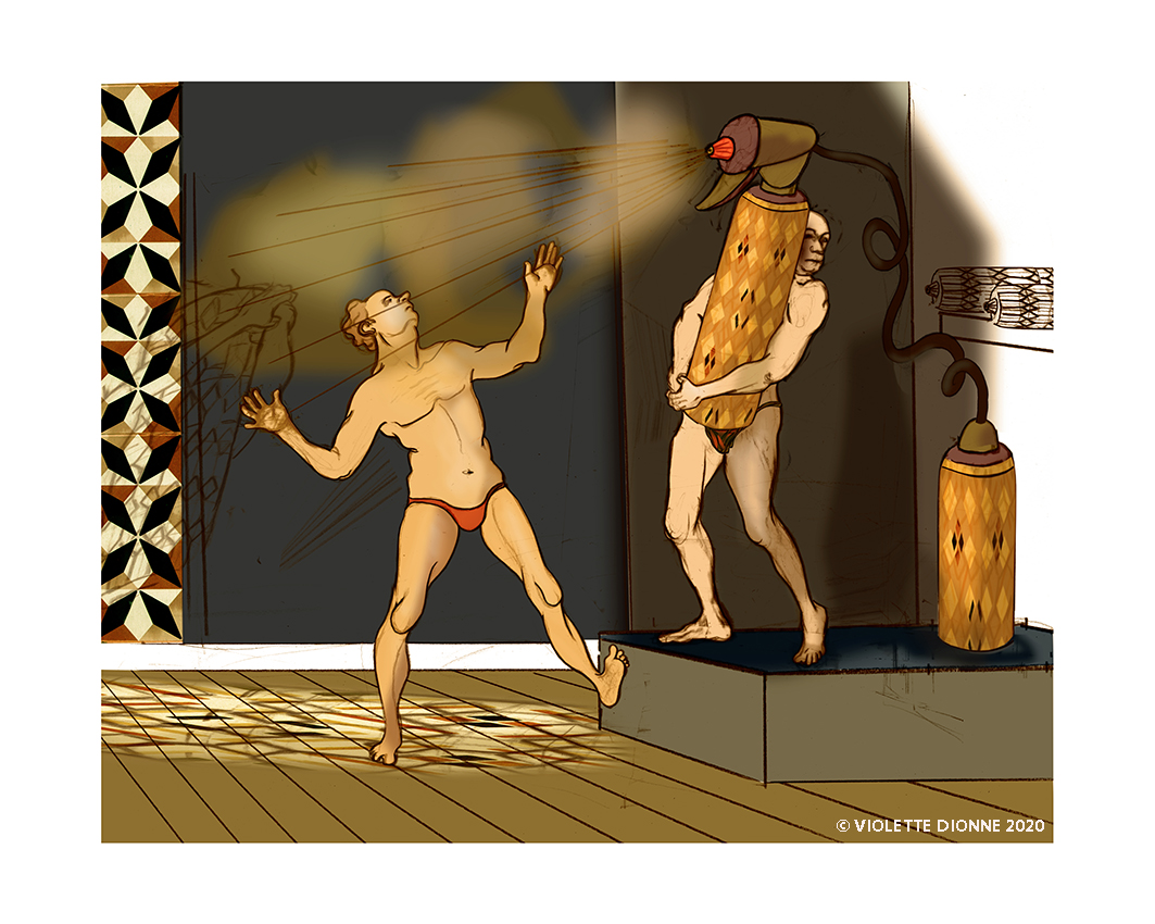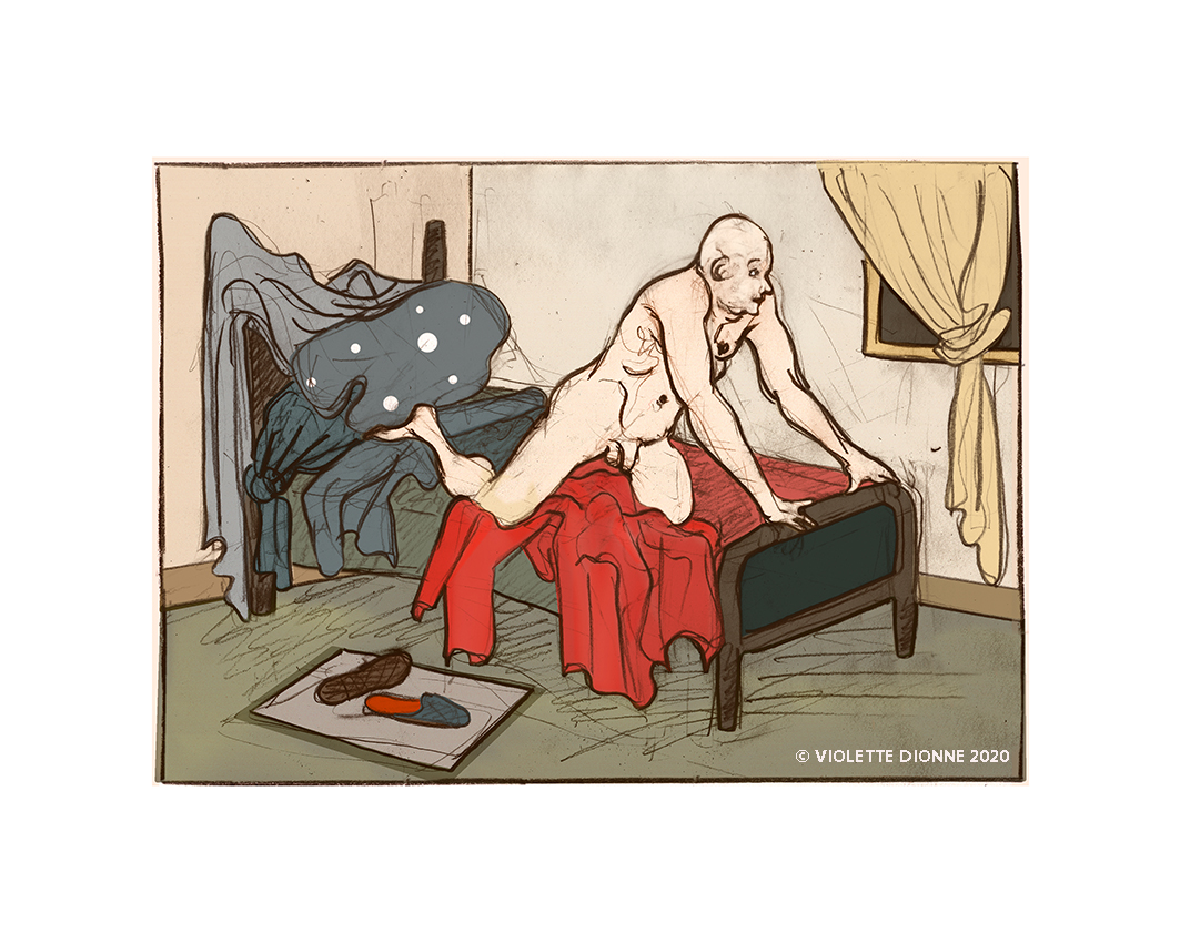 Dans cette série d’images, l’artiste utilise un certain nombre de procédés qui caractérisent la nouvelle figuration contemporaine. Ce sont des moyens d’expression narratifs qui jouent avec toutes les ressources techniques de la représentation (effets d’effacement, dégradés, graphisme, textures). Ces images colorées, ludiques, nous invitent à un parcours de scènes de la vie quotidienne en temps de pandémie. L’ensemble de cette production présente des aspects propres aux images d’Épinal qui reproduisent le plus souvent des sujets amusants, tirés de situations vécues, parfois loufoques. Ainsi, en usant de diverses stratégies esthétiques de détournement, l’artiste parvient à créer des petites comédies bouffonnes d’une «inquiétante étrangeté» à l’image du monde dans lequel nous vivons. La présence dans les images de dispositifs farfelus ‒ petits écrans de protection, ventilateurs bricolés par des amateurs ou encore systèmes de distanciation ‒ fait écho aux  sculptures récentes de Violette Dionne représentant des machines dysfonctionnelles.